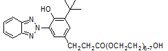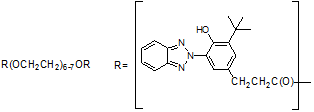 紫外線吸收劑UV-1130為苯并三唑混合物:b-[3-(2-H-苯并三唑-2-基)-4-羥基-5-叔丁基苯基]-丙酸聚乙二醇300酯,雙-{b-[3-(2-H-苯并三唑-2-基)-4-羥基-5-叔丁基苯基]-丙酸}-聚乙二醇300酯,聚乙二醇300